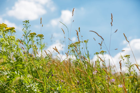 Bright wildflowers, green grass and blue sky with clouds. The concept of summer and flowering. Garden, park and nature concept. Wildlife concept.