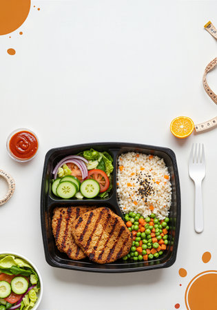 Restaurant menu ad, modern healthy food delivery service to home or office, lunch for worker