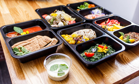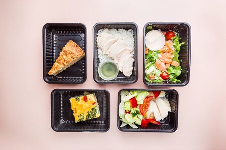 Healthy food delivery. Take away of take away food in plastic boxes.