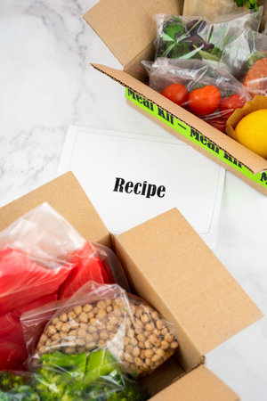 Food box meal kit of fresh ingredients and recipe blank order from a meal kit company, delivered, cooking at home.