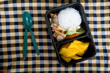 Fresh and delicious food with meat, rice and vegetables on a plastic box