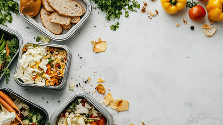 Top view of a waste-sorting station with separate bins for organic waste, showcasing vegetable peelings and leftover bread on a white background.