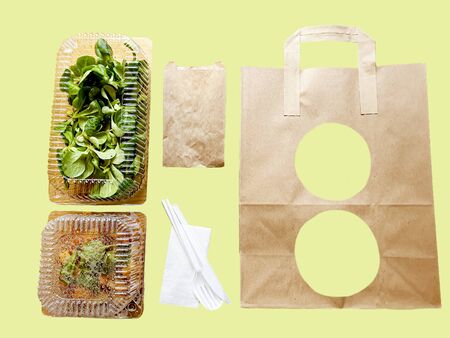 daily meals and snacks. Diet nutrition and brown paper bag package with copy space, Healthy food delivery from a restaurant, delicious food on the background of a paper bag package