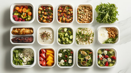 This vibrant image showcases an array of colorful meal prep options stored in containers, highlighting a balanced diet filled with fresh ingredients and healthy choices.
