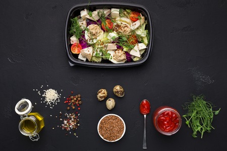 Fresh healthy salad in container with sauces and spices on black background, top view