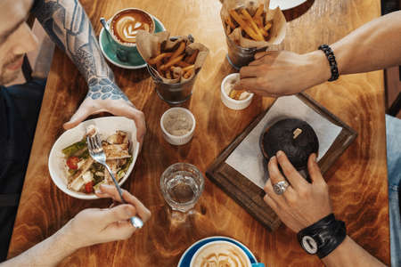 Friends eating burgers and french fries. Table with food view from above.