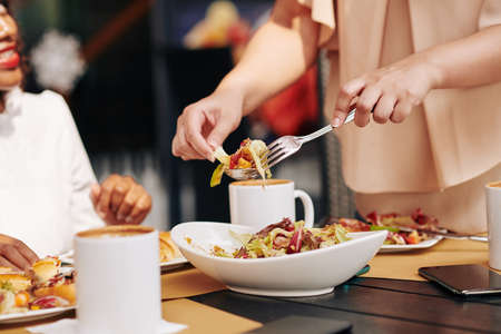Hands woman taking salad from the big bowl in the center of table