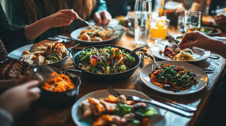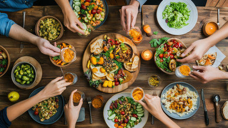 A vibrant gathering around a wooden table full of diverse dishes enjoyed by friends during a joyful mealtime