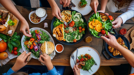 Friends share a delicious meal featuring grilled meats, fresh salads, and vibrant sides at a communal dining table