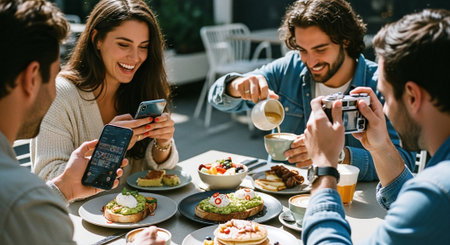 A group of friends enjoying brunch at a cafe, smiling and using smartphones, with various dishes on the table including avocado toast and fruit