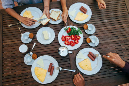 Enjoying breakfast with friends. Top view of group of people having meal together while sitting at the rustic wooden table