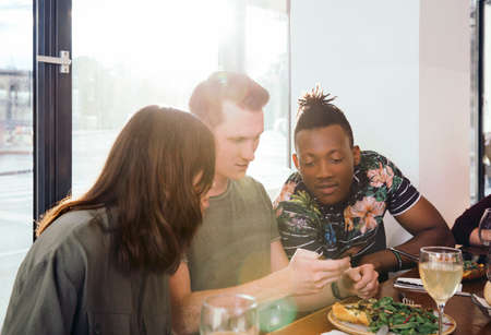 Friends looking at smart phone in restaurant
