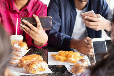 Group of unrecognizable people busy on mobile while having snacks together at restaurant - Concept of millennials having junk food, phone addiction, social media sharing and connection