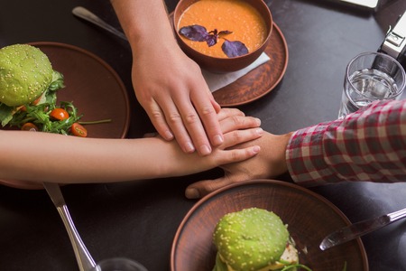 people eating in the restaurant view from above. A restaurant of classic European cuisine. Only peoples hands can be seen