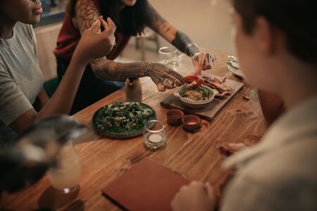 top view of people eating delicious food during dinner in restaurant