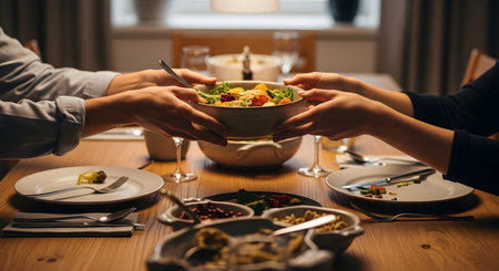 Close-up of two people passing a ceramic bowl filled with fresh green salad across a wooden dining table. The warm lighting and set table create a cozy atmosphere of communal dining and sharing healthy food.