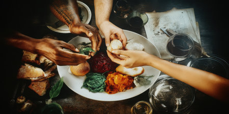 Rustic Feast with Friends. Sharing a Delicious Meal, Bread, Wine and Enjoy a Candlelit Dinner.