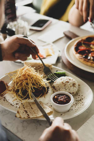 Group of friends hands with fork having fun eating variety food on the table.