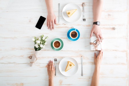 Hands of young woman receiving gift from man and having breakfast on wooden table