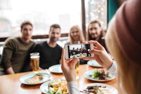 Woman using mobile phone to take pictures of food on the table. Taken on mobile and put on social networks.Take picture concept