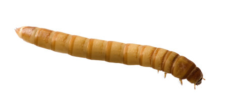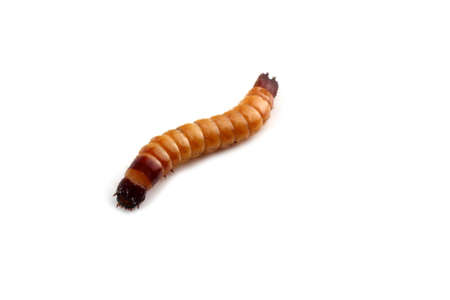 Close up of a mealworm, an alternative food ingredient for meat, on white background