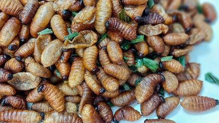 Chengdu, Sichuan, China. Fried Mealworm Larvae. Street Roasted Mealworm. Popular Snacks In Southeast Asia. New Source Of Protein. Fried Silk Worms Sichuan Snack. Mealworm Pupae Are Good Source Of Protein, Lipids, Minerals, And Vitamins. Modern Food Concept