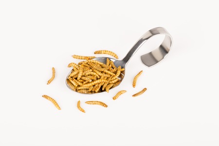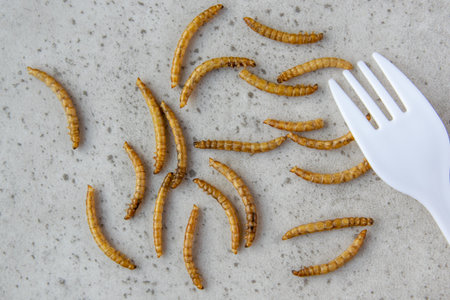 Yellow mealwurm near the white plastic fork. Dried worms eating as food or cooked insect meat on the stone background with white fork. Good source of protein.