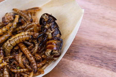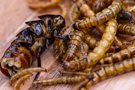 Fried wood grubs, mealworms and cockroach on a wooden chopping board. Fried insects as a source of protein in the diet.