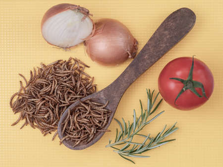 Cooking with mealworms, insect protein, with onion, tomato and rosemary.