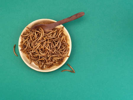 Mealworms in rustic bowl with spoon on turquoise background. Future food.