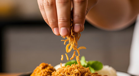 A close-up shot of a chef's hand sprinkling crispy fried shallots, or bawang goreng, as a garnish onto a delicious Asian meal. The golden-brown onions are falling onto the dish, adding texture and flavor. This image captures the final touch in food preparation, common in Indonesian and Southeast Asian cuisine.