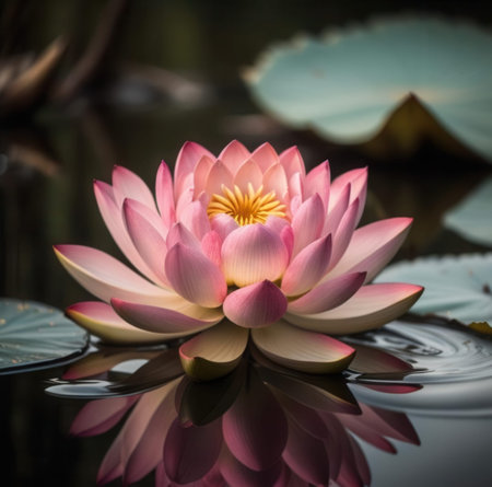 Delicate pink lotus flower floats serenely on calm water, creating gentle ripples and enhancing the tranquil atmosphere.