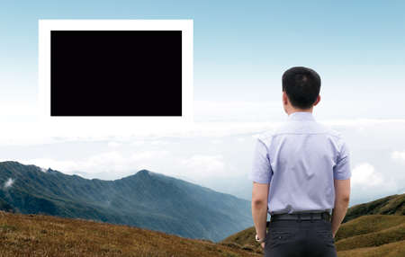 Imaginary camera focus man nature photographer concept. Photoshoot advertising. Creative lifestyle