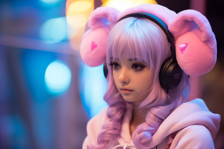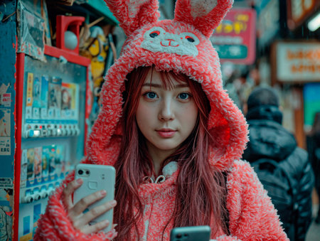 An AI illustration of a girl wearing a vibrant rabbit costume holding a phone.