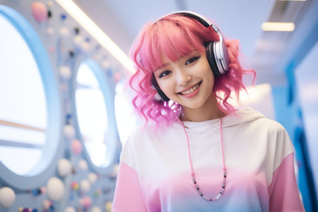 Young woman with pink hair and headphones holding a smartphone, looking at camera