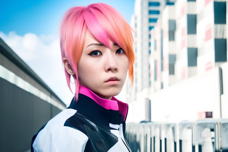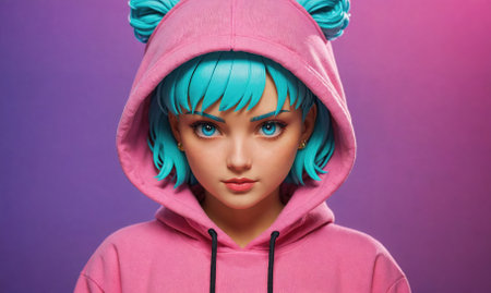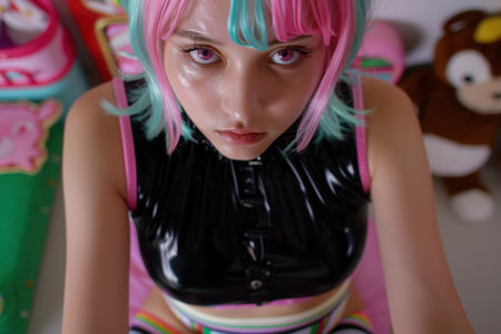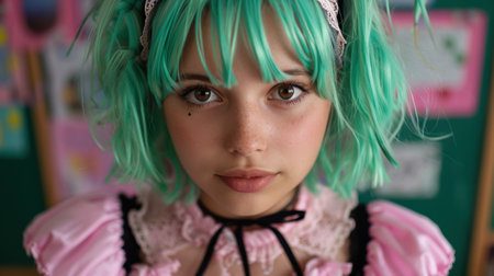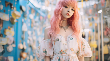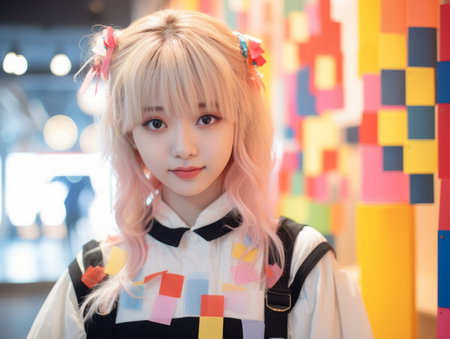 a young girl with pink hair wearing an outfit in front of a colorful wall