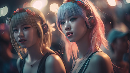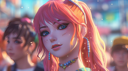 Cyberpunk anime streets illuminated with neon lights and holographic ads