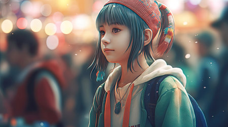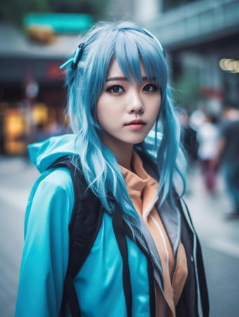 A young woman with blue hair in the middle of a bustling Asian street. Ai generated