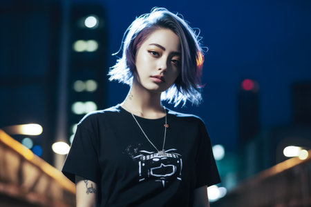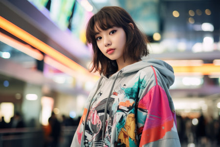 Amidst the glowing neon lights of Tokyo, a stylish individual showcases a bold street fashion, standing confidently in a captivating urban landscape that pulses with energy.