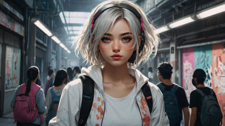 Beautiful japanese young girl waiting train in metro. Anime style art design. Elegant beautiful girl portrait