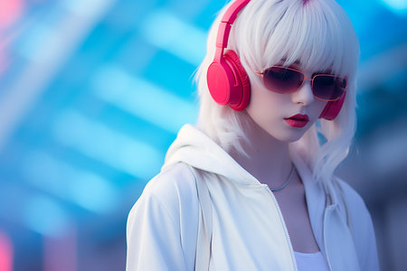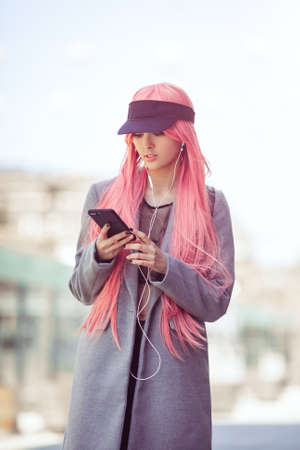 Japan anime cosplay. Colorful portrait of a young attractive smiling Asian woman in a coat with creative make-up wearing a pink wig. Trendy Japanese girl using smartphone listening music in earphones walking on the city street.
