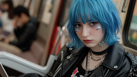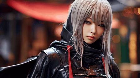 A captivating portrait showcasing a young woman with silver hair in a dark costume. The intriguing expression and stylish outfit evoke a sense of mystery and artistry.