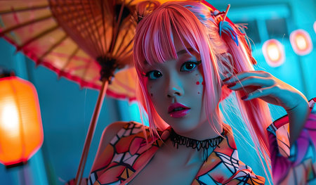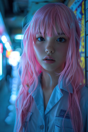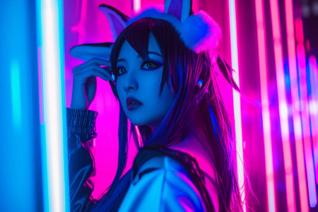 Full Body, Very Attractive Woman Cosplay Anime Japanese Style In Neon Light. Сoncept Neon Light Cosplay, Anime-Inspired Photoshoot, Japanese Style, Full Body Portraits, Attractive Woman.