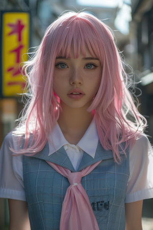 Japanese model with a pink wig, dressed in a bright school uniform, coming back home early in the morning after a club night, full-length photo emphasizing a comfortable and informal setting.