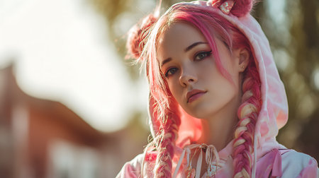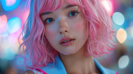 Vibrant portrait of a young girl with pink and purple hair surrounded by pink flowers