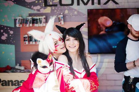 Moscow, Russia - July 21, 2019: two cosplayer girls in the images of oriental foxes