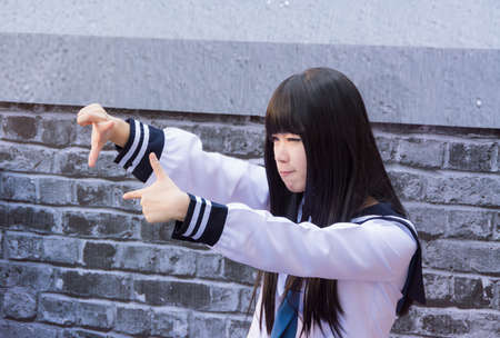 BANGKOK, THAILAND - MARCH 31: Cute Thai cosplayer poses a hand-frame gesture for photographers in 3rd Thai-Japan anime festival on March 31, 2013.