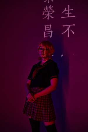 anime woman in wig and school uniform in neon light on purple backdrop with hieroglyphs projection