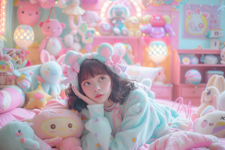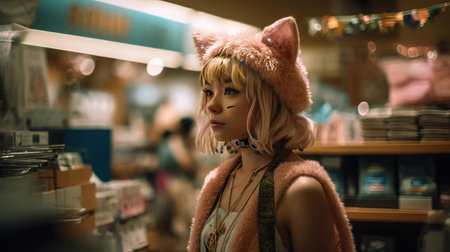 An AI generated illustration of a young Asian woman wearing cat ears, in a bookstore