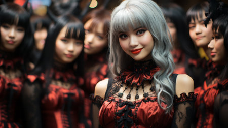 A fierce group of women, dressed in vibrant costumes and adorned with bold makeup and bangs, strike a pose for an outdoor photo, exuding confidence and power
